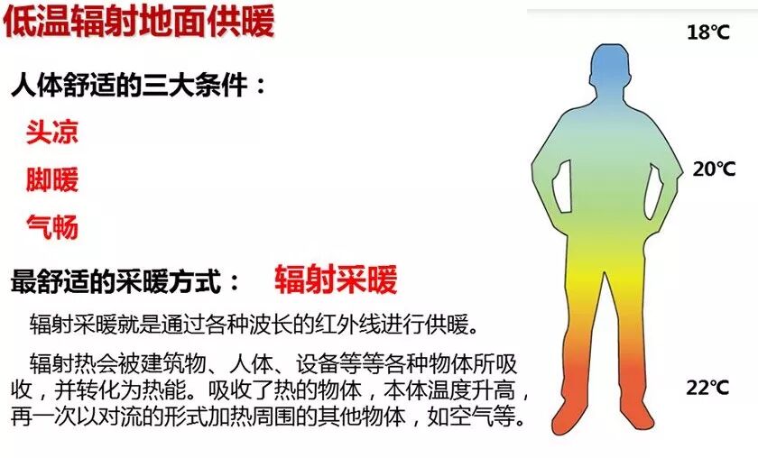 优点:安全、舒适、宁静、干净、美观、低温采暖可接多种热源设备;