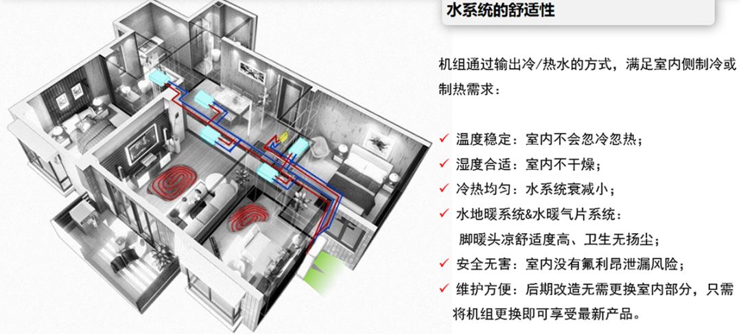 ①安全无害:室内管道里面是水,完全没有氟利昂泄漏风险,保证室内空气品质,呵护婴儿敏感的呼吸道,保护家人健康