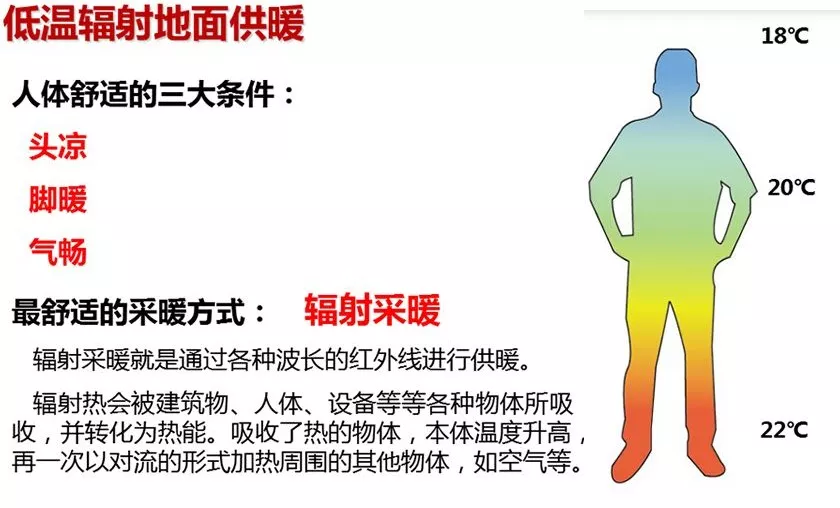 优点:安全、舒适、宁静、干净、美观、低温采暖可接多种热源设备;